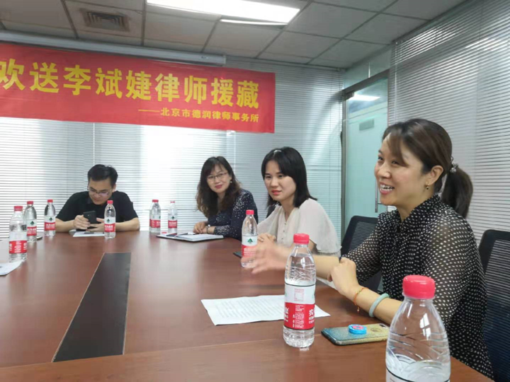 7月9日上午,欢送李斌婕律师赴藏参加“1+1”中国法律援助志愿者行动座谈会在北京市德润律师事务所举行。区司法局律师综合指导科科长、区律协秘书长师锋、德润律师事务所主任童朋方及律师代表参加座谈会。