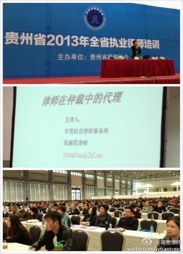 2013年3月26日上午,受贵州省律师协会的邀请,北京海淀区律师协会副会长、北京市华贸硅谷律师事务所张丽霞主任在贵州国际会展中心为全省近3000名律师做题为《律师在仲裁中的代理》的专题讲座。张丽霞律师作为资深律师和资深仲裁员,从仲裁与律师的关系;仲裁与诉讼的异同;律师在仲裁代理中应注意的问题和诉讼律师在仲裁中易犯的错误等方面向与会律师分享了自己的体会!