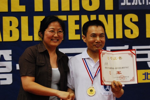 图为:刘军副秘书长给获得男单冠军的王昆律师颁奖 图为:刘军副秘书长给朱振武副会长颁发捐赠赛优胜奖