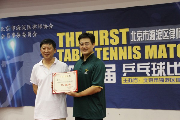 图为:李海彦主任给男子单打亚军获得者彭绍群律师颁奖 图为:李海彦主任给董刚副会长颁发捐赠赛优胜奖