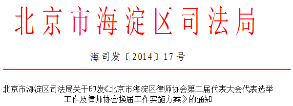 根据北京市司法局《关于做好东城等11个律师协会换届工作的通知》(京司发〔2014〕97号)、《北京市海淀区律师协会章程》,经研究决定,现印发《关于北京市海淀区律师协会第二届代表大会代表选举工作及律师协会换届工作实施方案》,区律师协会党委、第一届代表大会会长会要认真组织学习、宣传,引导辖区各律师事务所将《方案》的精神和内容传达到每一个律师,确保律师的知晓率和参与率100%。各司法所要加强对本辖区内律师事务所选举工作的组织、监督。
