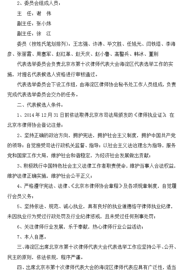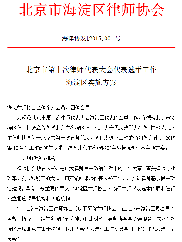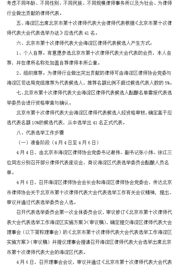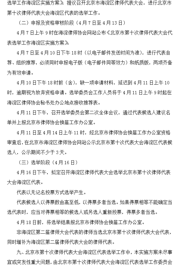 北京市第十次律师代表大会代表选举工作海淀区实施方案