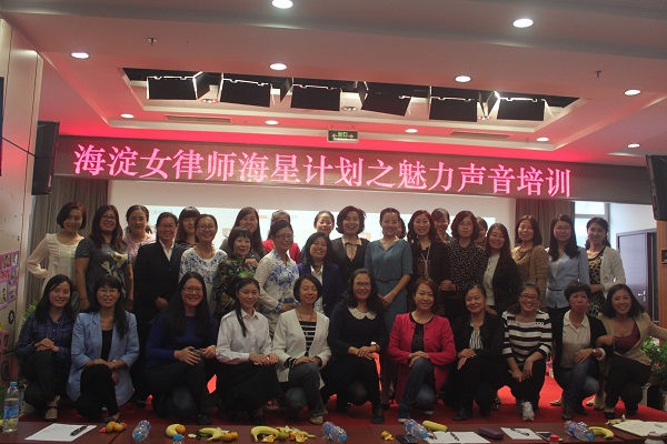 2015年9月28日下午,北京市海淀区律师协会女律师工作委员会为了提升全区女律师的声音形象,提高沟通能力,和海淀区妇联在海淀区妇女儿童活动中心一层大厅联合举办了“海星计划之魅力声音”的培训活动。北京市海淀区律协副会长米良渝、律协党委委员任旭光、海淀律协女工委主任雷丹玫、副主任杨晓红、殷新丹、钱慧云、杨琳和来自全市的50余位女律师和部分男律师参加了培训活动。