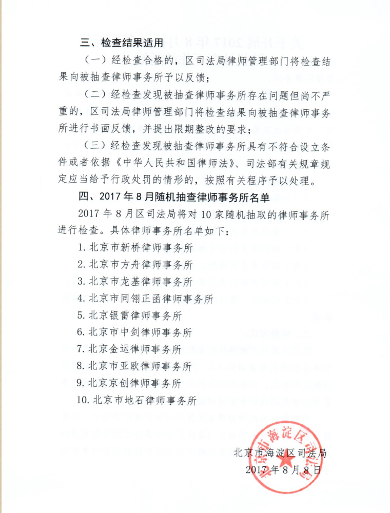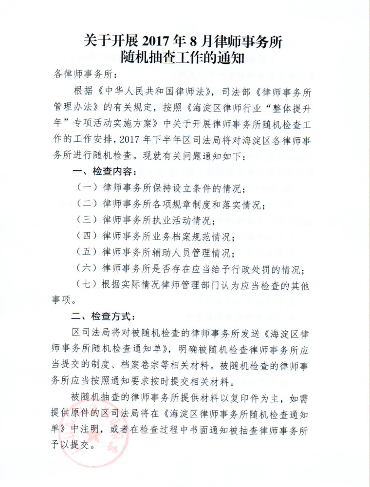 转发:海淀区司法局《关于开展2017年8月律师事务所随机抽查工作的通知》