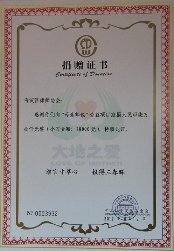 图为:中国妇女发展基金会为海淀律协颁发捐赠证书