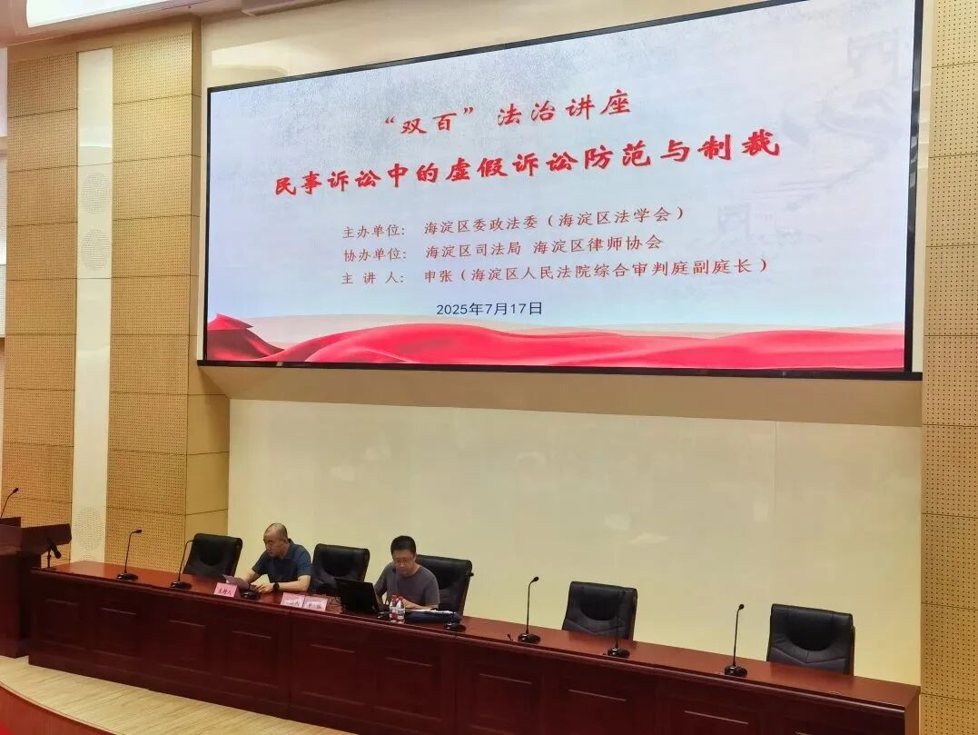 近日,海淀区委政法委(区法学会)、区司法局、区律师协会在海淀区政府第二办公区报告厅成功举办政法系统“双百”法治讲座系列活动第二场——“民事诉讼中的虚假诉讼防范与制裁”专题培训。讲座汇聚了律师代表、公安、法院、检察院、司法局等法律工作者代表及政法委机关200余人,共同聆听海淀区人民法院申张法官的授课。本次活动由区法学会常务副会长、区委政法委常务副书记冯军主持,区委政法委副书记秦小英、区司法局副局长韩……