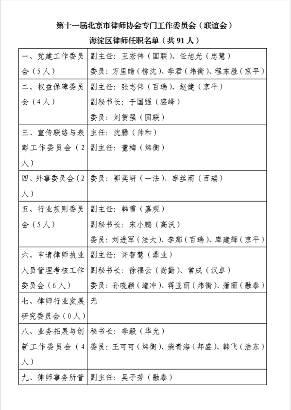 第十一届北京市律师协会专门工作委员会(联谊会)海淀区律师任职名单